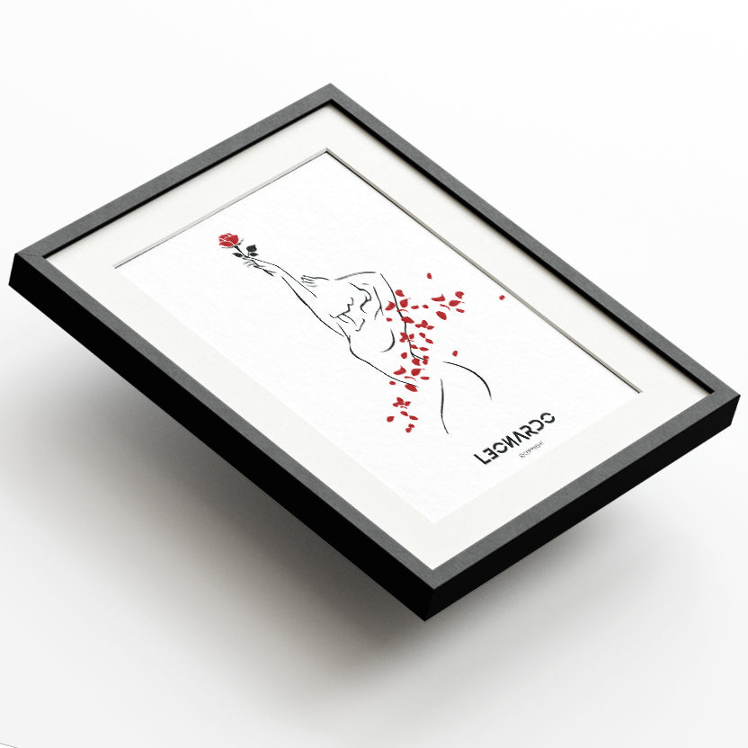 Un’anima tormentata che danza delicatamente tra i petali di rose, un incontro di dolcezza sospeso tra fragilità e forza. In questo inferno racchiuso, l’artista idealizza la sua musa, incarnando Ade e Persefone in un abbraccio eterno fatto di passione e mistero, dove solo i dettagli raffigurano la bellezza.